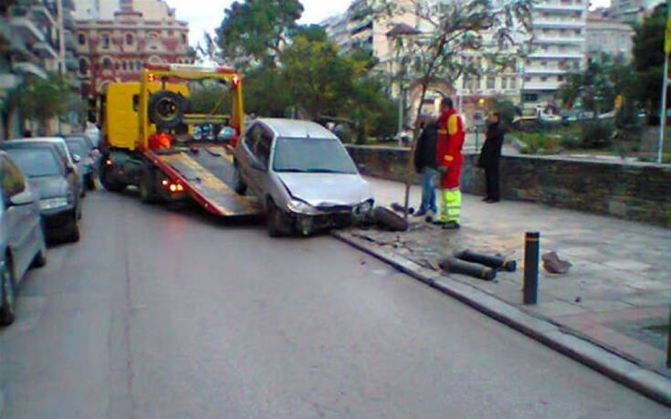 Κολωνάκια από το πεζοδρόμιο επί της Μακένζι Κινγκ στο κέντρο της Θεσσαλονίκης, «ξήλωσε» μετά από τρελή πορεία Ι.Χ. σήμερα το πρωί.