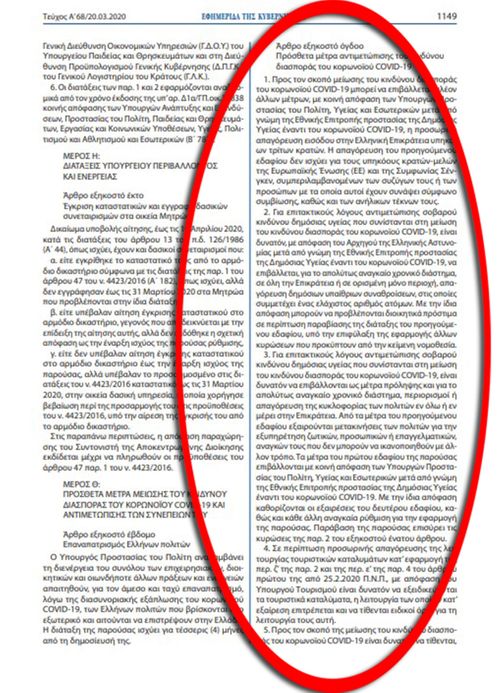 Με την ίδια απόφαση καθορίζονται οι εξαιρέσεις καθώς και κάθε άλλη αναγκαία ρύθμιση. Στα φυσικά πρόσωπα που παραβιάζουν τα μέτρα χωρίς να θίγονται οι κυρώσεις που προβλέπονται στον Ποινικό Κώδικα, επιβάλλεται με αιτιολογημένη πράξη της αρμόδιας αρχής, για κάθε παράβαση, διοικητικό πρόστιμο 5.000 ευρώ