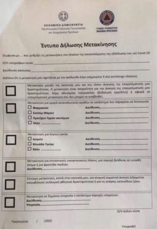 Ήδη το φως της δημοσιότητας είδε το έντυπο δήλωσης μετακίνησης που θα καλούνται να υπογράψουν οι πολίτες.