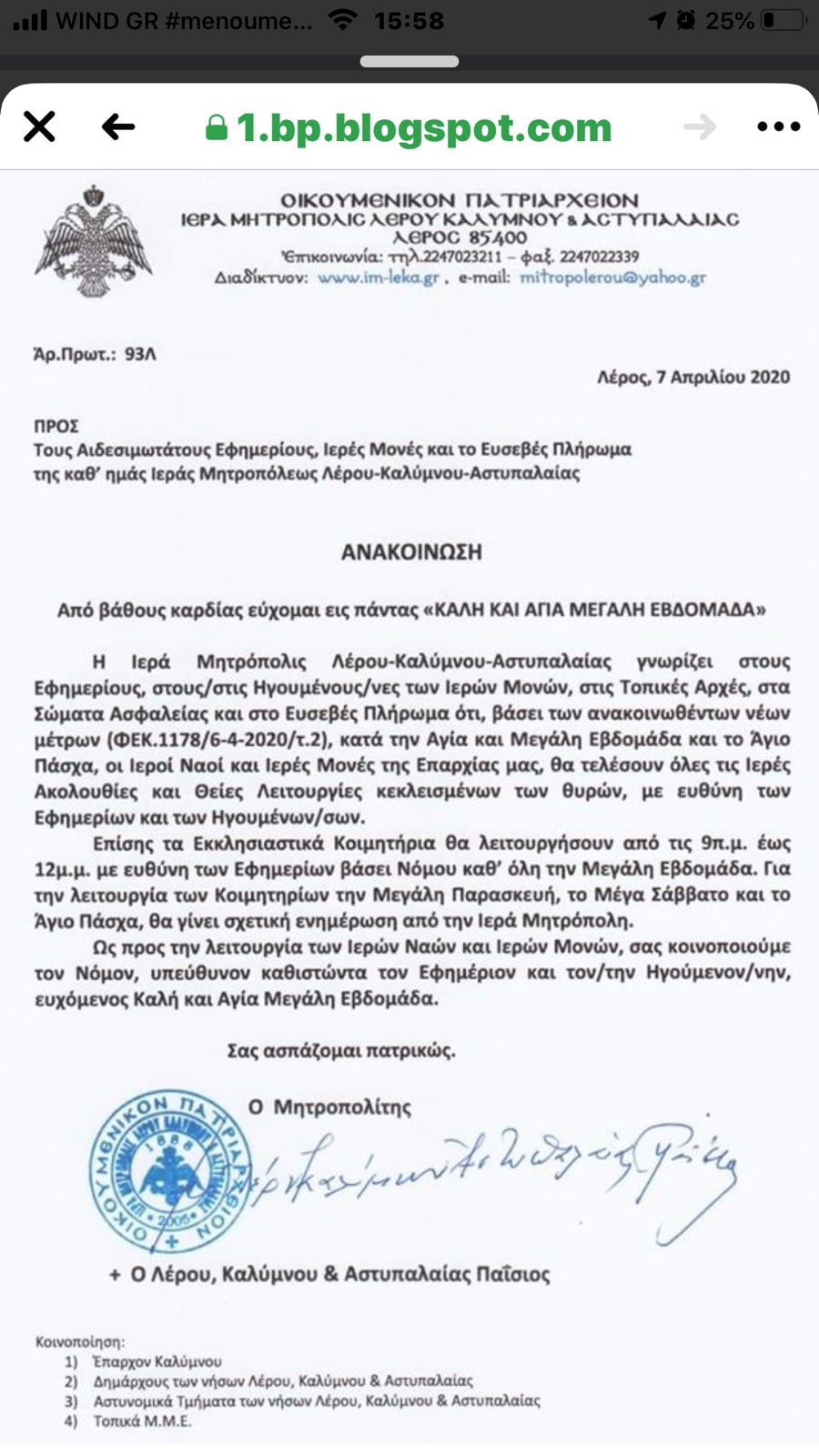 Ανακοίνωση της Μητρόπολης σχετικά με τη λειτουργία των ναών το Πάσχα και τη μεγάλη εβδομάδα