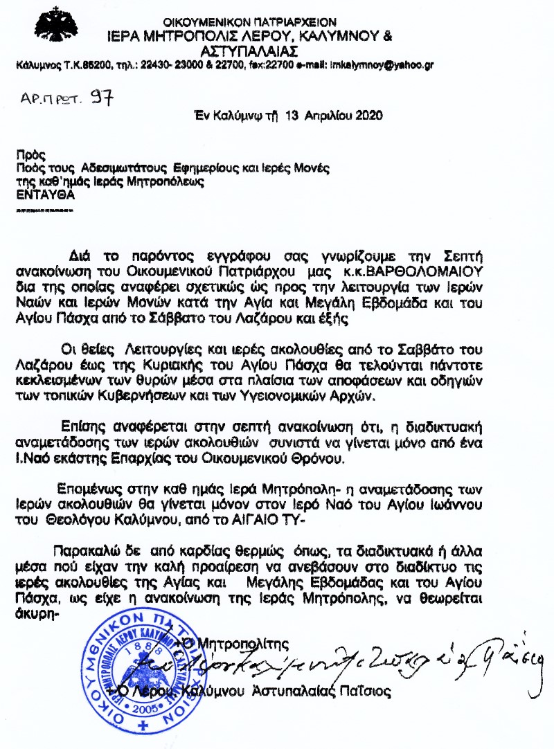 Σε απάντηση αυτής της ανακοίνωσης, η Ιερά Μητρόπολη Λέρου Καλύμνου και Αστυπάλαιας, γνωστοποιεί πως θα υπάρχει διαδικτυακή αναμετάδοση μόνο από τον Ιερό Ναό του Αγίου Θεολόγου μέσω του ΑΙΓΑΙΟ ΤV, ενώ ευχαριστεί τα διαδικτυακά μέσα για την πρωτοβουλία που είχαν να ανεβάσουν διαδικτυακά τις λειτουργίες των Άγιων Ημερών.