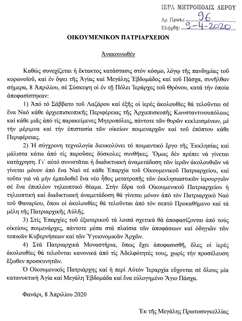 Με ανακοίνωση του , το Οικουμενικό Πατριαρχείο διευκρινίζει τις συνθήκες με τις οποίες θα γίνει η τέλεση των λειτουργιών της Μεγάλης Εβδομάδας αλλά και την διαδικτυακή κάλυψη αυτών από τηλεοπτικούς σταθμούς: