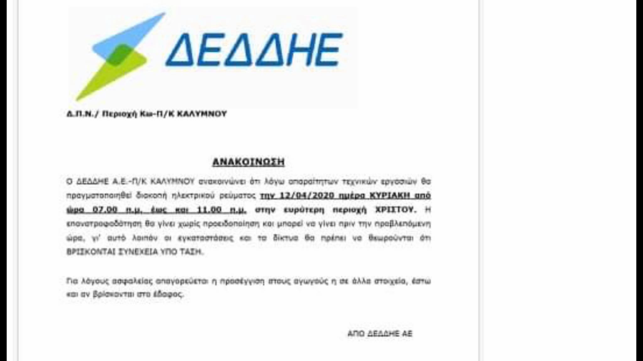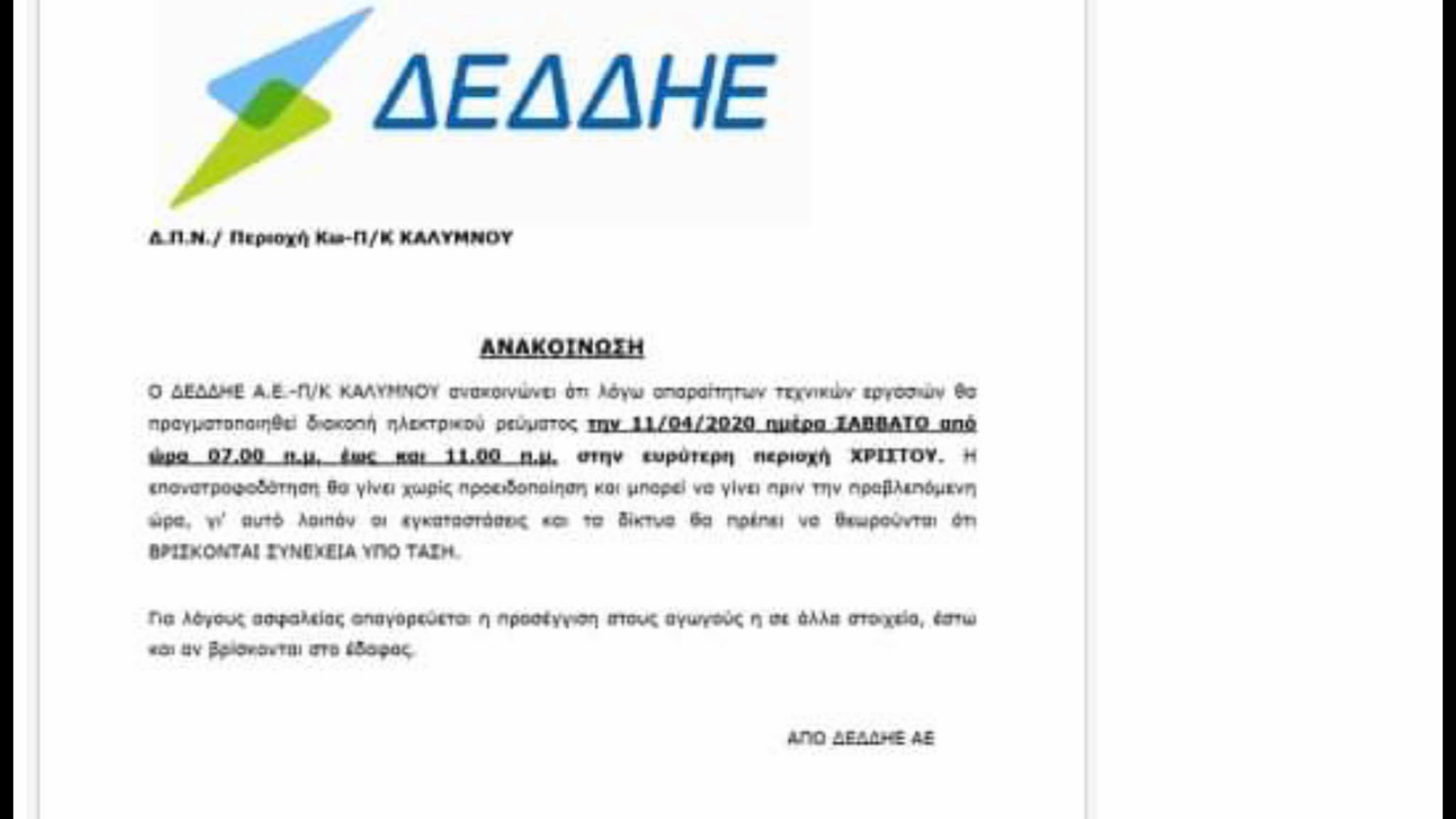 ΔΙΑΚΟΠΕΣ ΡΕΥΜΑΤΟΣ ΣΤΗΝ ΠΕΡΙΟΧΗ ΤΟΥ ΧΡΙΣΤΟΥ ΑΥΡΙΟ ΣΑΒΒΑΤΟ ΚΑΙ ΚΥΡΙΑΚΗ