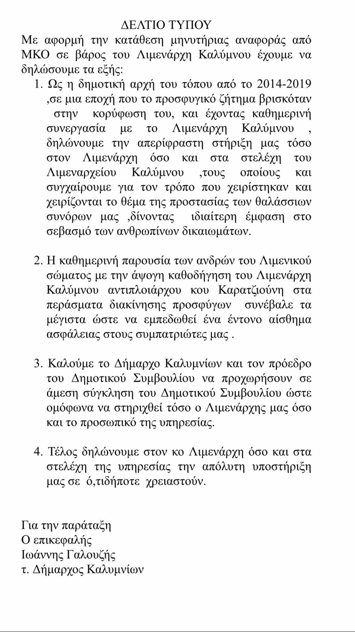 Δελτίο τύπου συμπαράστασης προς τον λιμενάρχη από την δημοτική παράταξη "Νέα Κάλυμνος"