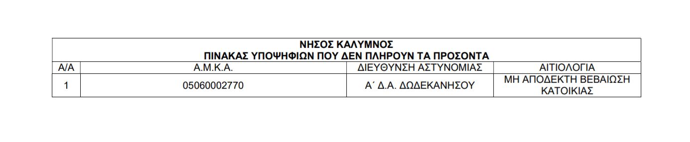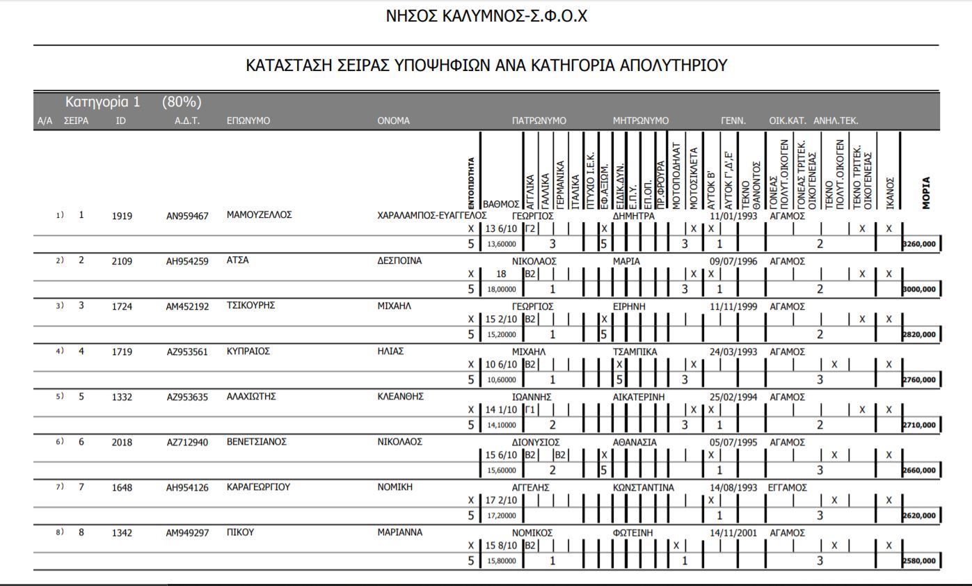 Δημοσιεύτηκαν σήμερα, 16-4-2020, οι τελικοί αναμορφωμένοι, πινάκες κατ' άρχην πληρούντων τα προσόντα κατα φθίνουσα σειρά μορίων αλλά και αυτών που δεν πληρούν τα προσόντα και τις προϋποθέσεις για πρόσληψη, του διαγωνισμού πρόσληψης Συνοριακών Φυλάκων Ορισμένου Χρόνου που είχε προκυρήξη προ ολίγων μηνών η Ελληνική Αστυνομία. Τα αποτελέσματα για το νησί της Καλύμνου έχουν ως εξής: