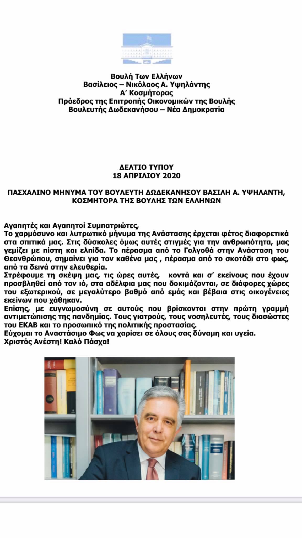 Πασχαλινό μήνυμα Βασίλη Υψηλάντη