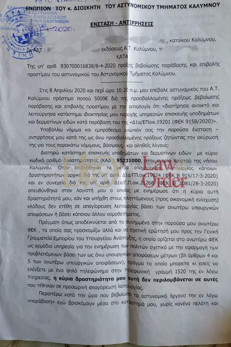 Μάλιστα ο καταστηματάρχης μην αντέχοντας να βρεθεί άδικα, ενώπιον δικαστών προκειμένου να αποδείξει την αθωότητα του και να τον βαρύνει ένα άδικο κατ αυτόν χρέος ύψους 5.000 ευρώ, κατέθεσε αναφορά στο υπουργείο Προστασίας του πολίτη κατά του διοικητή του αστυνομικού τμήματος του νησιού αλλά και κατά παντός υπευθύνου για την «αυθαίρετη επιβολή προστίμου, παράνομη σύλληψη και σχηματισμός ποινικής δικογραφίας, με πρόθεση και καθ’ υπέρβαση των καθηκόντων τους». Στην αναφορά μάλιστα ο καταγγέλων τονίζει πως, «Προφανέστατα το αστυνομικό όργανο μπέρδεψε την έννοια των υπό απαγόρευση λειτουργίας δραστηριοτήτων, με τις πληττόμενες από την κρίση πανδημία. Όμως το να προβλέπεται ως πληττόμενη οικονομικά κάποια δραστηριότητα δεν σημαίνει ότι είναι και απαγορευμένη δραστηριότητα». Παράλληλα υποστηρίζει πως, «Όλα αυτά τα εξέθεσε στον αξιωματικό υπηρεσίας του Α/Τ Καλύμνου την ίδια ημέρα, όμως εκείνοι αρνούνταν να τα δεχτούν υποστηρίζοντας ότι έχουν ΦΕΚ το οποίο απαγορεύει τη λειτουργία της επιχείρησης μου , το οποίο αν και επανειλημμένα ζήτησα να μου επιδείξουν, αρνήθηκαν επικαλούμενοι διάφορες δικαιολογίες». Το μόνο που ζητάει ο κύριος Ν.Τ είναι να υπάρξει αναίρεση του επιβληθέντος προστίμου, προκειμένου να τηρηθεί η νομοθεσία και να αποκατασταθεί η αδικία σε βάρος του.