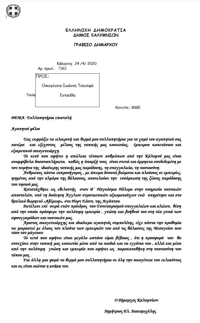 ΘΕΜΑ: Συλλυπητήρια επιστολή.