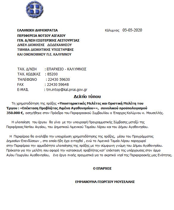 Περιφέρειας Νοτίου Αιγαίου, του Δημοτικού Λιμενικού Ταμείου Λέρου και του Δήμου Αγαθονησίου.