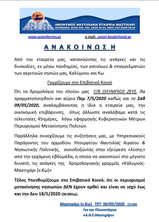 Σε ανακοίνωση προχώρησε η ΑΝΕΜ FERRIES, στην οποία αναφέρει πως τα δρομολόγια της Πέμπτης 7/5/2020 και του Σαββάτου 9/5/2020 θα πραγματοποιηθούν κανονικά. Την οικονομική επιβάρυνση επωμίζεται η ίδια η εταιρεία, όπως ακριβώς κάνει εδώ και 45 ημέρες, λόγω εφαρμογής των Κυβερνητικών Μέτρων Περιορισμού Μετακίνησης Πολιτών. Η εταιρεία παράλληλα υπενθυμίζει πως οι περιορισμοί των επιβατών ισχύουν μέχρι 18/5/2020 ενώ η εταιρεία είναι στην διαδικασία συζητήσεων, προκειμένου να βρεθεί λύση, που να ικανοποιεί στο μέγιστο δυνατό τις επιβατικές ανάγκες.