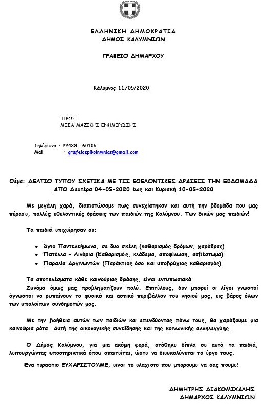 Με μεγάλη χαρά, διαπιστώσαμε πως συνεχίστηκαν και αυτή την βδομάδα που μας πέρασε, πολλές εθελοντικές δράσεις των παιδιών της Καλύμνου. Των δικών μας παιδιών!