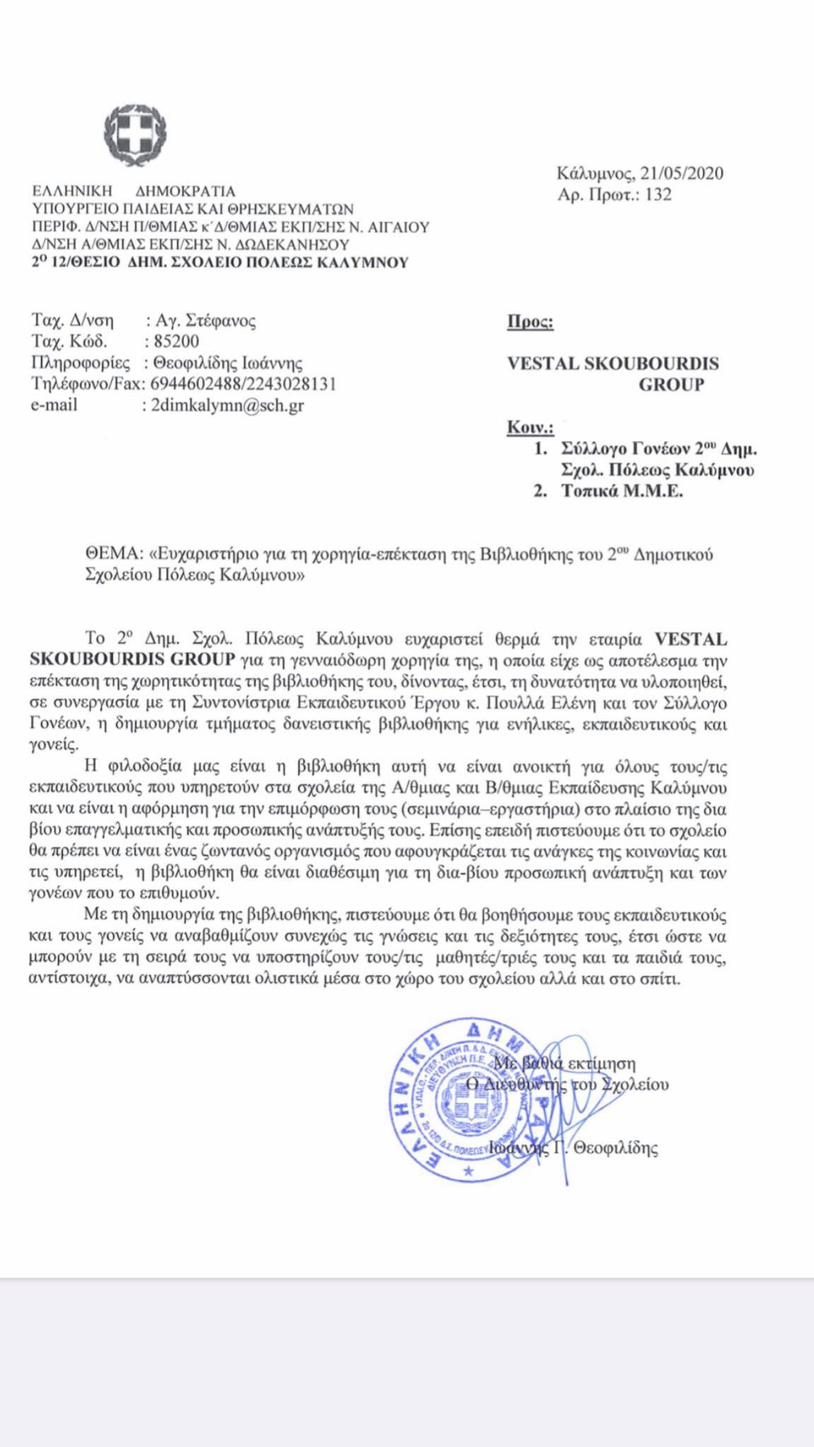 Ευχαριστήριο από το 2ο Δημοτικό σχολείο πόλεως προς την VESTAL SKOUBOURDIS GROUP