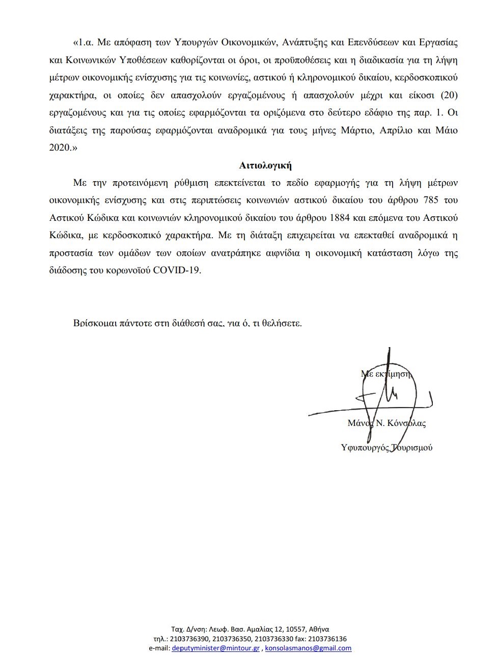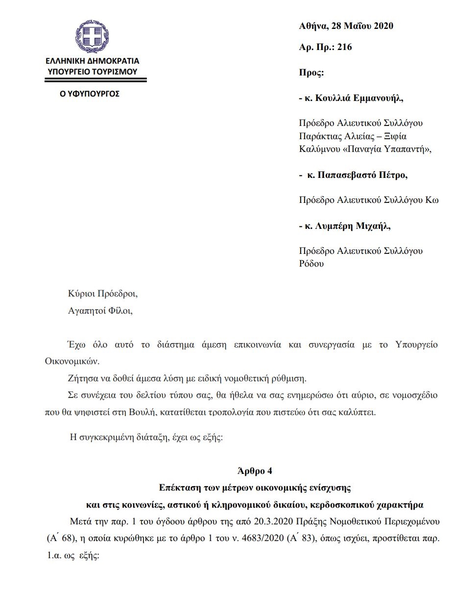 Σε απάντηση της επιστολής - Δελτίου Τύπου των Αλιέων για το θέμα του αποκλεισμού τους από την αποζημίωση Ειδικού Σκοπού των 800 ευρώ, ο Υφυπουργός Τουρισμού, κ. Μάνος Κόνσολας , κοινοποίησε με επιστολή του απάντηση προς τους Αλιείς με την οποία τους διαβεβαιώνει πως το θέμα έχει ήδη συζητηθεί με το Υπουργείο Οικονομικών, και θα κατατεθεί αύριο, με ειδική νομοθετική ρύθμιση (την οποία και επισυνάπτει στην εν λόγω επιστολή) σε συνεδρίαση της Βουλής.