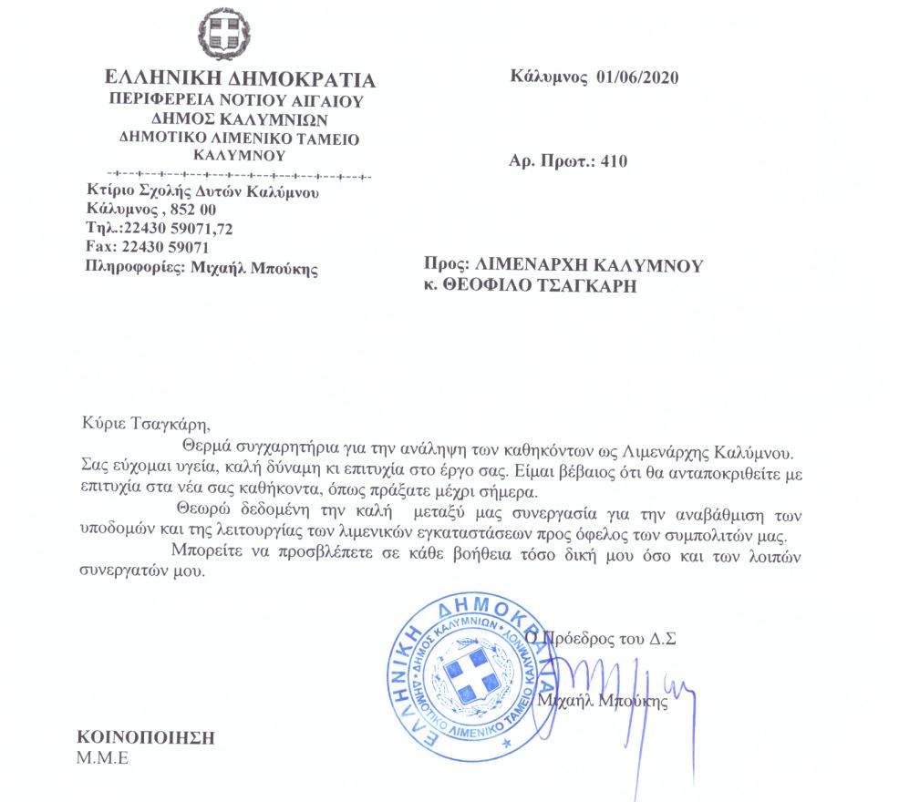 Συγχαρητήρια επιστολή του Προέδρου ΔΛΤ προς το νέο Λιμενάρχη Καλύμνου κ. Θεόφιλο Τσαγκάρη