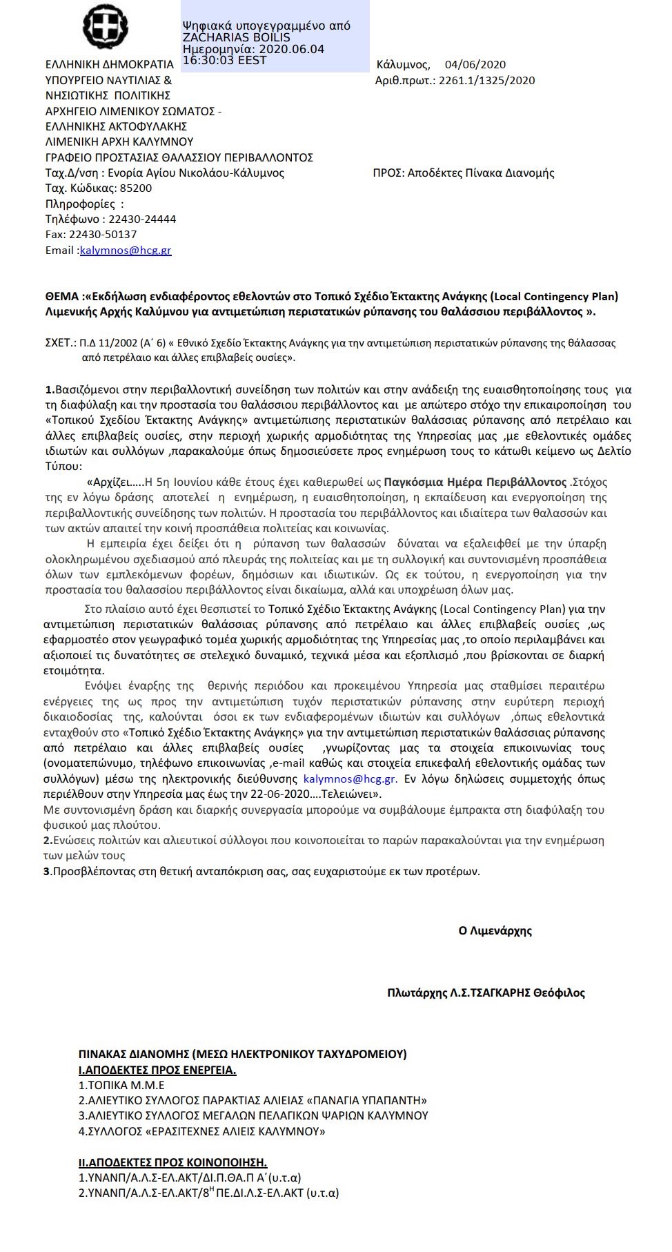 Με επιστολή από το αρμόδιο γραφείο της Λιμενικής Αρχής Καλύμνου, γνωστοποιείται πως συγκροτείται ομάδα για το Τοπικό Σχέδιο Έκτακτης Ανάγκης που αφορά αντιμετώπιση περιστατικών θαλάσσιας ρύπανσης από πετρέλαιο και άλλες επιβλαβείς, ρυπογόνες ουσίες. Αίτηση μπορεί να δηλώσει ο οποιοσδήποτε ενδιαφερόμενος ιδιώτης αλλά και σύλλογος, αποστέλλωντας με ηλεκτρονικό ταχυδρομείο τα στοιχεία επικοινωνίας του (ονοματεπώνυμο, τηλέφωνο επικοινωνίας. e mail, καθώς και τα στοιχεία του επικεφαλής του κάθε συλλόγου.) στην διεύθυνση Αυτή η διεύθυνση ηλεκτρονικού ταχυδρομείου προστατεύεται από τους αυτοματισμούς αποστολέων ανεπιθύμητων μηνυμάτων. Χρειάζεται να ενεργοποιήσετε τη JavaScript για να μπορέσετε να τη δείτε., μέχρι τις 22-6-2020.
