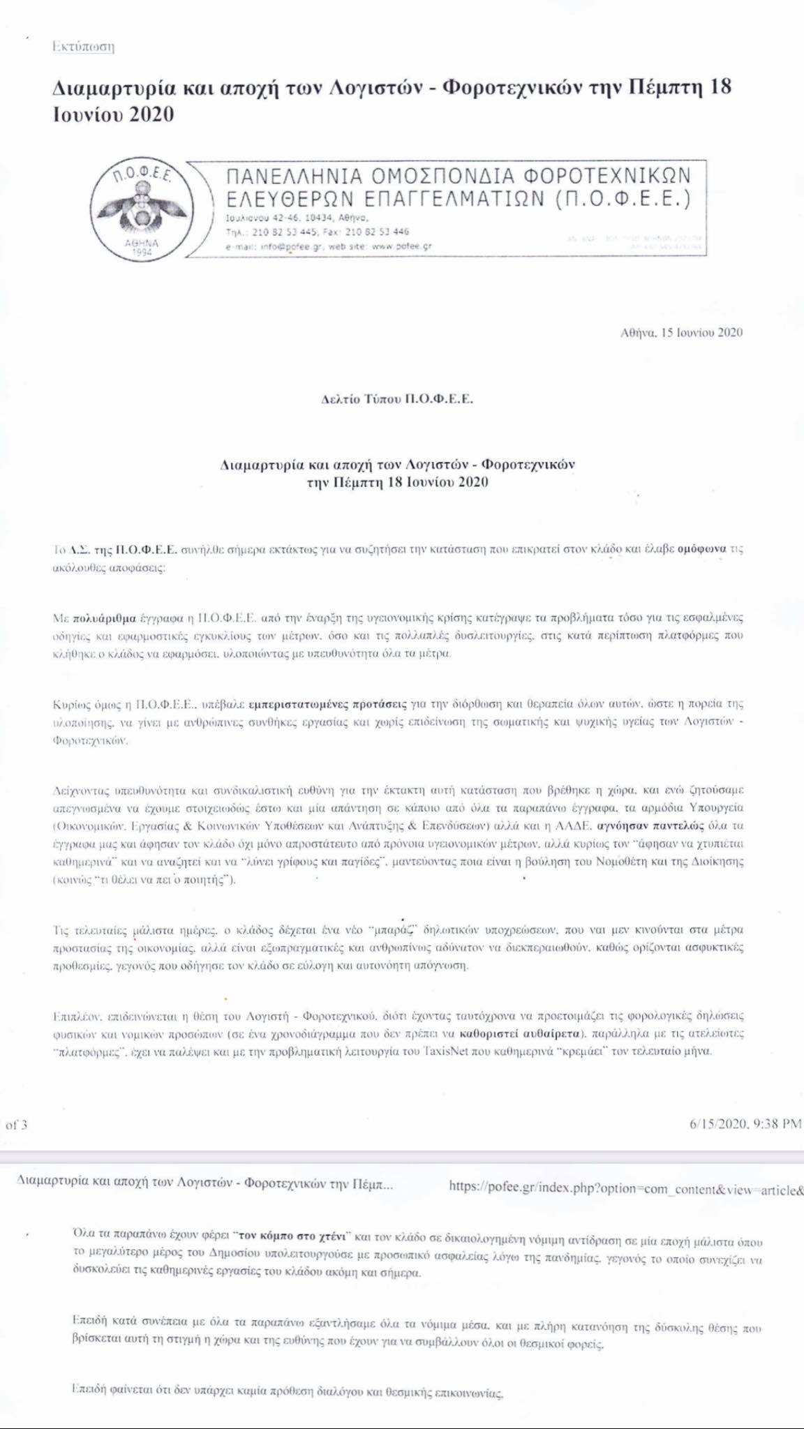 Διαμαρτυρία φοροτεχνικών και αποχή την Πέμπτη 18 Ιουνίου