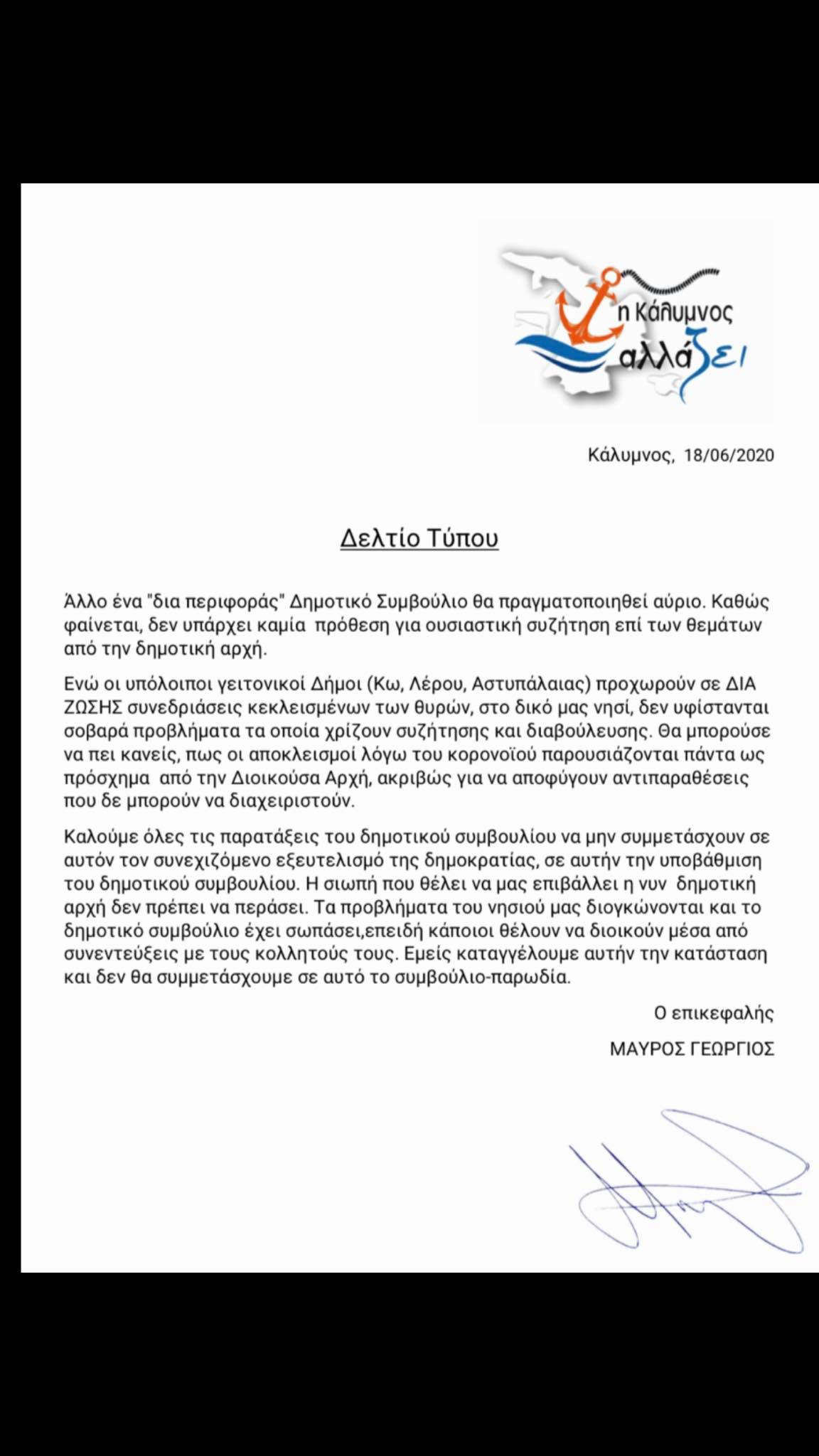 Δελτίο τύπου της παράταξης " Η Κάλυμνος αλλάΖΕΙ" για την διά περιφοράς συνεδρίαση του δημοτικού συμβουλίου