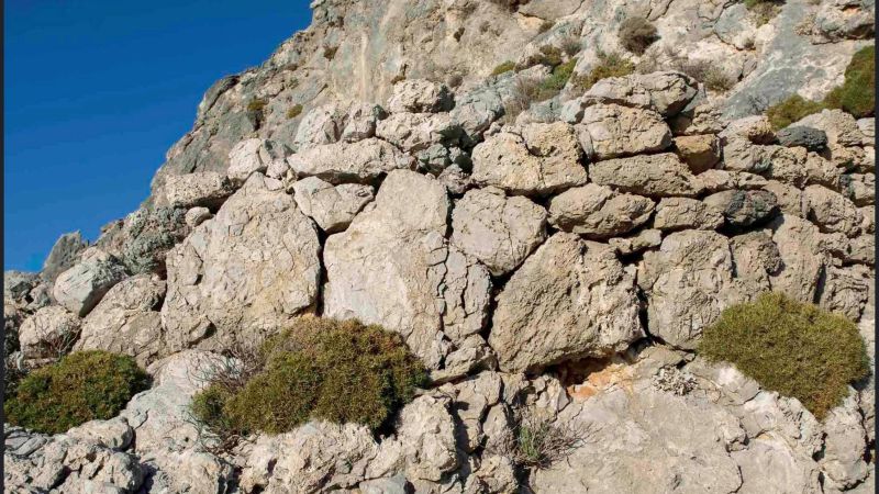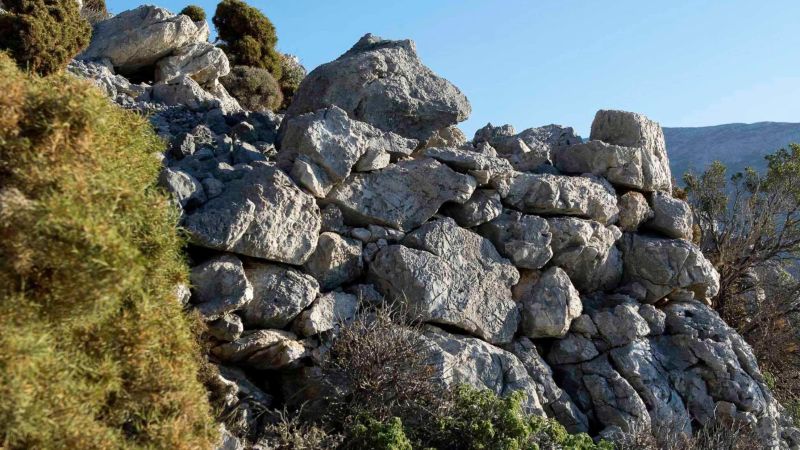 Ένα ζευγάρι αναρριχητές, διακόσια μέτρα ψηλότερα, κατέβαιναν το βουνό. Ανέβαινα σφιχτός, όπως πάντα στην αρχή προτού γειωθώ. Ένα τέταρτο μετά διασταυρωθήκαμε, το σώμα μου είχε μπει σε ρυθμό. Το μονοπάτι από τους αναρριχητές σε ανεβάζει γρήγορα και με ασφάλεια και το ακολούθησα. Αριστερά, στα πενήντα μέτρα, είδα τα πρώτα σημάδια ανθρώπινης παρέμβασης: ένα παλιό κτίσμα ημικυκλικό ξεπρόβαλε κάτω από τη ρίζα του κατακόρυφου βράχου. Γκρεμισμένο σχεδόν ολόκληρο άφηνε μόνο την βάση του να δείξει το παλιό στοίβαγμα της πέτρας. Πήγα προς τα κει και είδα πατήματα που οδηγούσαν ψηλότερα. Είχε καιρό να περάσει άνθρωπος, μόνο κατσίκια με φανερά τα χνάρια τους. Έφτασα στο τέρμα σε ένα πλάτωμα τέσσερα περίπου τετραγωνικά. Από κάτω, στα είκοσι μέτρα, η ρεματιά χωρίς δυνατότητα να προχωρήσω. Πάνω είχε πατήματα για να σκαρφαλώσω ένα απότομο βράχο δέκα μέτρων. Δεν το ‘κανα όμως, χωρίς δεύτερο άτομο και εξοπλισμό δεν ήξερα τι θα συναντήσω. Κάτι μου ’λεγε όμως ότι ήμουν κοντά. Γύρισα πίσω και ανέβηκα ξανά προς τα πάνω από το μονοπάτι. Το χώμα μετά τις βροχές μαλακό και οι βράχοι χαλαροί, έτοιμοι να πάρουν τα κάτω… Ευτυχώς που υπάρχουν και τα αχινοπόδια, έχουν στοιβαχτεί πολλά χαλίκια στα πόδια τους και κρατούν το βουνό ακόμα ζωντανό. Στα εβδομήντα μέτρα πιο ψηλά αριστερά μου κάτι σαν τοίχος ξεφάνηκε. Ας είναι αυτό, είπα μέσα μου.