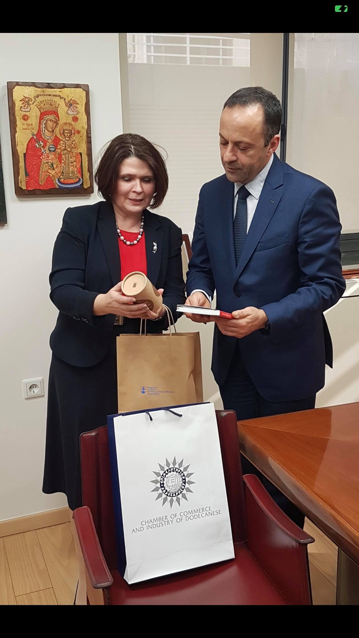 Ο πρόεδρος του Επιμελητηρίου, δώρισε στην Πρέσβειρα της Σλοβακικής Δημοκρατίας στην Ελλάδα το έμβλημα του Επιμελητηρίου Δωδεκανήσου κι εκείνη με τη σειρά της δώρισε στον κ. Πάππου έναν τουριστικό οδηγό της Σλοβακίας και τοπικά προϊόντα της χώρας.