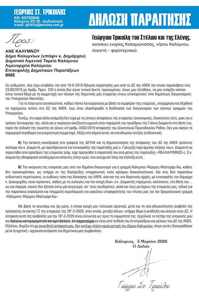 Την οριστική παραίτηση του από την ΑΝΕΚ ανακοίνωσε σήμερα με δελτίο τύπου ο δημοτικός σύμβουλος κ. Γιώργος Τρικοίλης. Στο δελτίο τύπου τονίζει ότι την προηγούμενη παραίτηση του την πήρε πίσω προκειμένου να μην δημιουργηθούν θέματα στην διεκδίκηση των επιδοτούμενων γραμμών από την ΑΝΕΚ. Στην συνέχεια καυτηριάζει την στάση της παράταξης στην οποία ανήκει όταν σε έκτακτη συνεδρίαση του Δ.Σ. της ΑΝΕΚ , απόντος του κ.Διαμαντή και με προεδρεύοντα τον πρώην δήμαρχο κ. Γαλουζή, αποφασίσθηκε να ζητηθεί η παραίτηση του κ. Διαμαντή και ενώ αυτό ζητήθηκε, ο κ. Διαμαντής απλά "αδιαφόρησε" και κανείς δεν αντέδρασε. Στην συνέχεια αναφέρει την απώλεια της γραμμής Κάλυμνος -Ψέριμος - Μαστιχάρι λόγω της έλλειψης απαιτούμενου από την διακήρυξη εγγράφου και κατηγορεί ως συνυπεύθυνους τόσο την τωρινή διοίκηση της ΑΝΕΚ όσο και την νυν δημοτική αρχή του κυρίου Διακομιχάλη. Τέλος αφήνει υπόνοιες για την νομιμότητα της απόφασης αναβολής της προγραμματισμένης ΓΣ της ΑΝΕΚ . Παρακάτω παραθέτουμε αυτούσιο το δελτίο τύπου.
