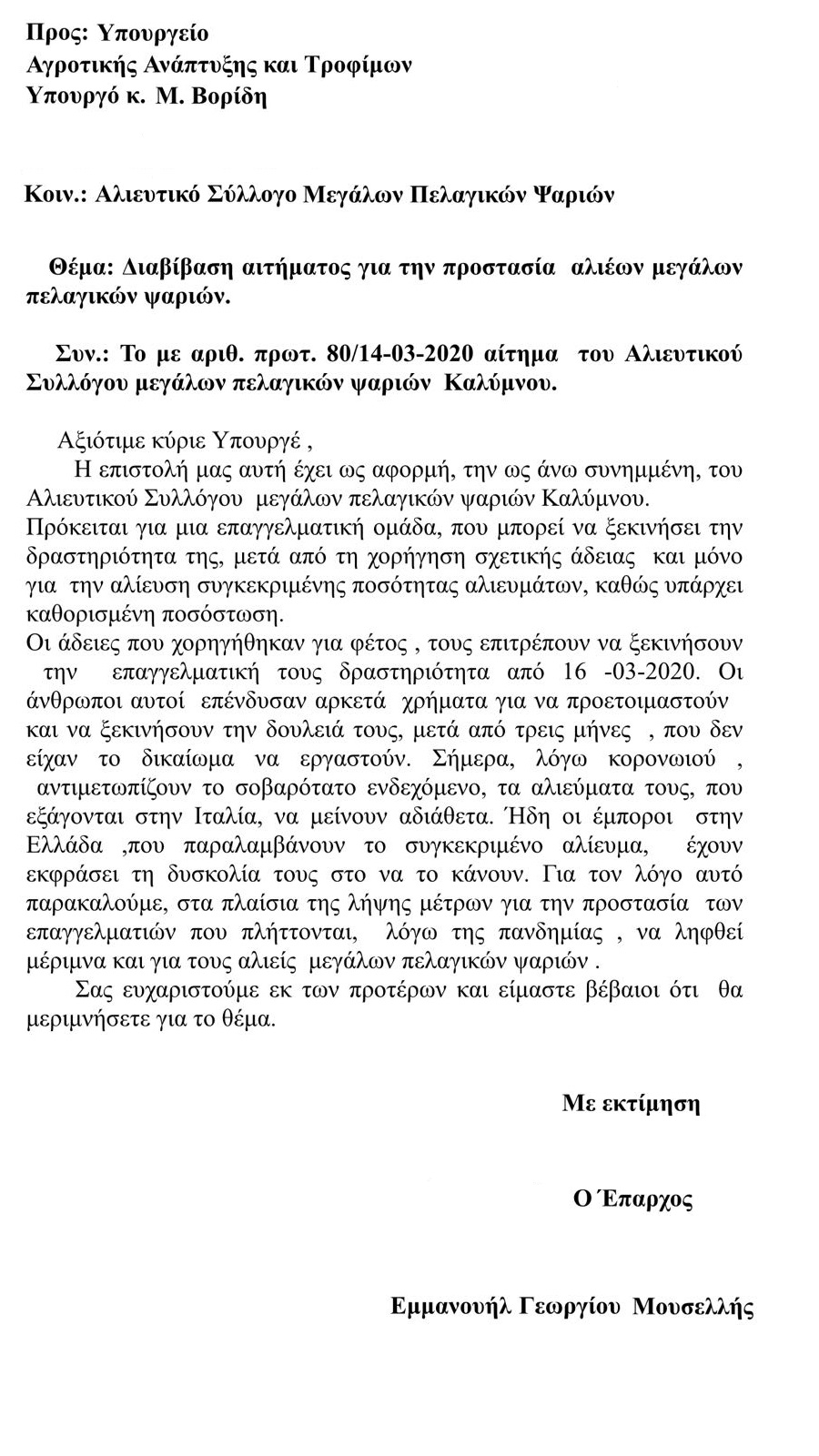 Επιστολή με αποδέκτη τον Υπουργό Αγροτικής Ανάπτυξης κ. Μάκη Βορίδη απέστειλε ο Έπαρχος Καλυμνίων κ. Μανόλης Μουσελλής με σκοπό την προστασία και την λήψη μέτρων για τους αλιείς μεγάλων πελαγικών ψαριών λόγω της επιδημίας στη Ιταλία, καθώς η ζήτηση των αλιευμάτων στην γείτονα χώρα έχει πέσει κατακόρυφα. Δείτε την επιστολή παρακάτω: