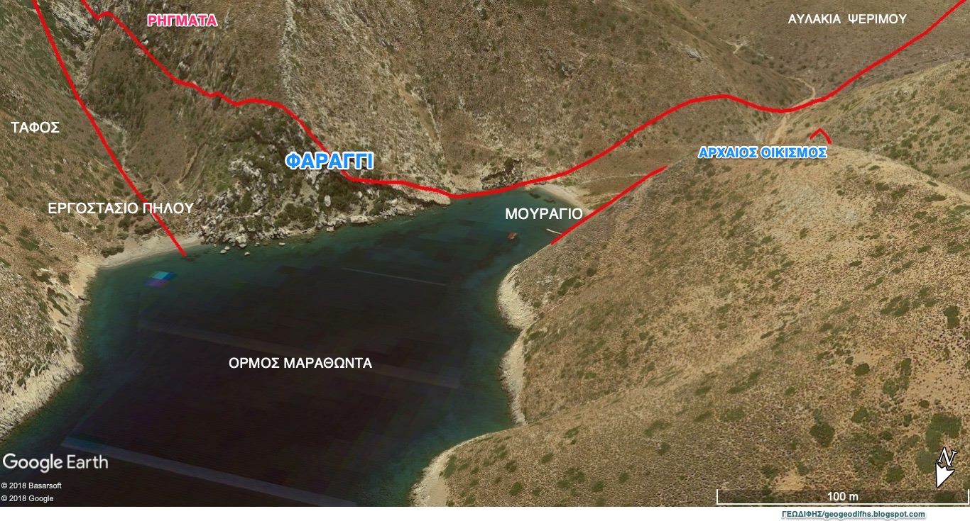 Το φαράγγι στα Μαραθώντα δημιουργήθηκε κατά την διάρκεια ενός πολύ ισχυρού σεισμού. Ποιος θα μπορούσε να ήταν; Κατά πάσα πιθανότητα ο Υπερμέγιστος του Κεραμεικού του 554 μ.Χ, των 7+ βαθμών. Το εκτιμώμενο επίκεντρο του συναντάται περίπου 16 χιλιόμετρα νοτιοανατολικά. Προφανώς η ισχυρή κίνηση από τον σεισμό προκάλεσε παράκτια καθίζηση στο νότιο τμήμα του όρμου, τα ίχνη της ακόμη είναι ορατά. Το γεγονός αυτό είχε ως άμεσο αποτέλεσμα να κοπεί στα δύο ο βράχος και να διαμορφωθεί το σημερινό πέρασμα, το μοναδικό προς το εργοστάσιο του πηλού.