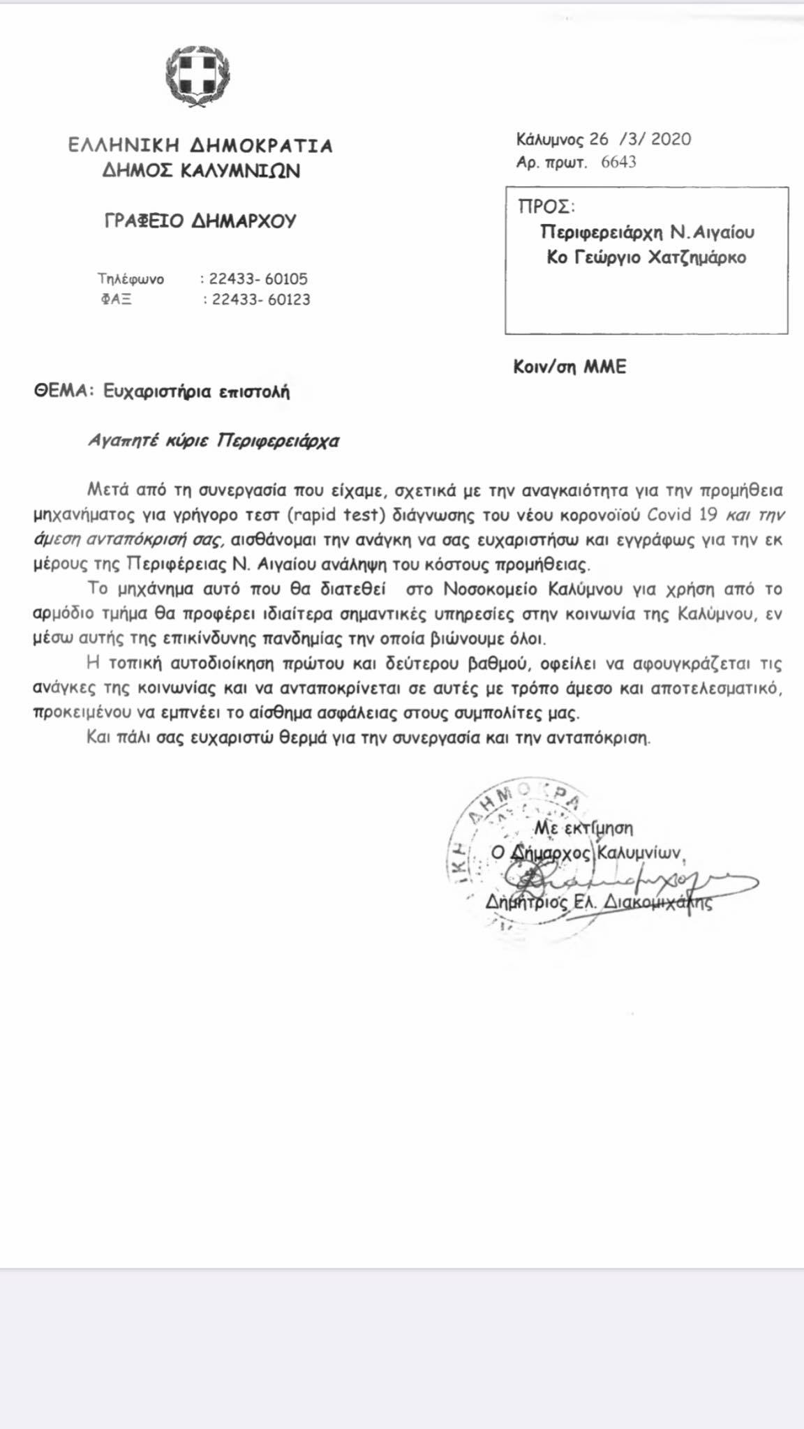 Ευχαριστήρια επιστολή Δημάρχου προς τον Περιφερειάρχη για την προμήθεια του μηχανήματος γρήγορης διάγνωσης του COVID-19